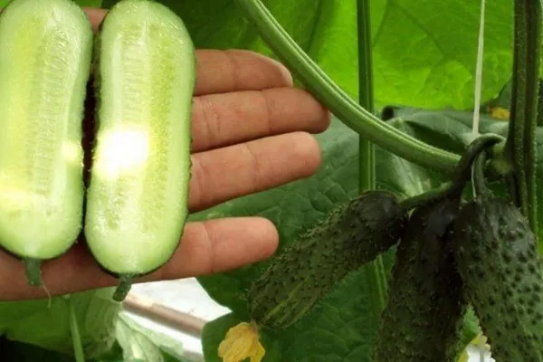 Плоды собраны в пучки по 3 штуки и более. Они короткие, цилиндрические, глянцевые, зелёного цвета, достигают в длину 10-12 см. Вес одного огурца — около 90-100 г. У плодов бугорчатая поверхность, на зелёном фоне встречаются короткие размытые полоски. Бугорки расположены со средней плотностью. Имеются белые шипы.