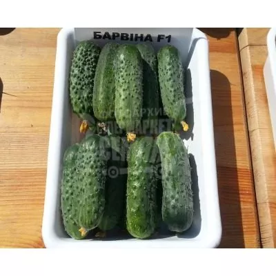 Плоды — визитная карточка Барвины. Они отличаются выровненностью, что особенно ценится при консервировании. Форма удлиненно-цилиндрическая, классическая для засолочных типов. Длина зеленцов составляет 10-12 см, а масса колеблется от 71 до 87 грамм.