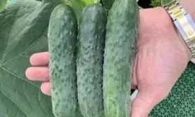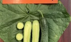 Плоды имеют стабильную, удлиненно-цилиндрическую форму и выровненный размер – 16-20 см при массе около 180 граммов. Окраска зеленая с короткими, более светлыми полосами, доходящими примерно до трети длины огурца. Поверхность слаборебристая, покрыта частыми бугорками среднего размера.