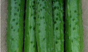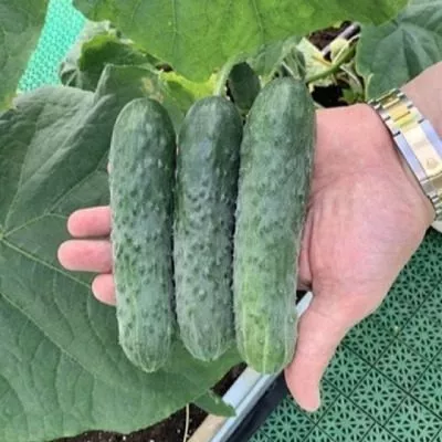 Плоды имеют стабильную, удлиненно-цилиндрическую форму и выровненный размер – 16-20 см при массе около 180 граммов. Окраска зеленая с короткими, более светлыми полосами, доходящими примерно до трети длины огурца. Поверхность слаборебристая, покрыта частыми бугорками среднего размера.