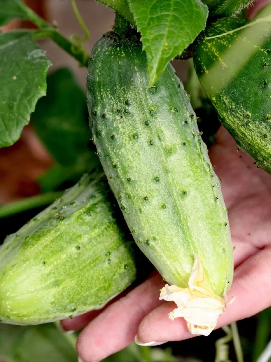 Собранные зеленцы имеют овальную форму, крупнобугорчатую поверхность и массу в среднем 95-107 граммов. Именно такая структура — плотная мякоть и толстая кожица — обеспечивает им отличную лежкость и транспортабельность. Плоды долго не вянут и хорошо переносят перевозку, что делает сорт интересным для тех, кто выращивает огурцы на продажу.
