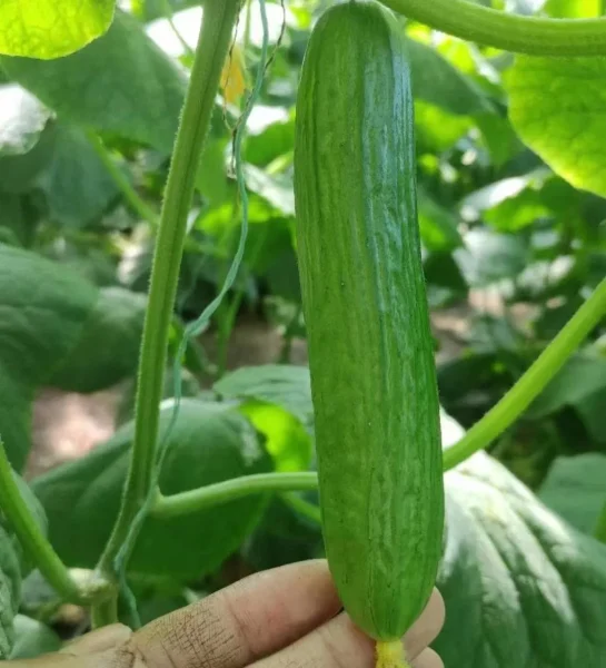 Но настоящая гордость этого гибрида — его плоды. Они длинные, ровные, классической цилиндрической формы, длиной 14-16 см и массой около 100-110 граммов. Окраска насыщенно-зеленая, без полос или пятнистости. Поверхность плода гладкая, блестящая, с редкой, почти незаметной бугорчатостью.