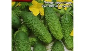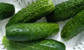 Плоды имеют выровненный, товарный вид. Они короткие, цилиндрической формы, со средней массой 90-100 граммов. Окраска классическая: основной зеленый фон дополнен короткими светлыми полосами, которые обычно доходят лишь до первой трети длины огурца.
