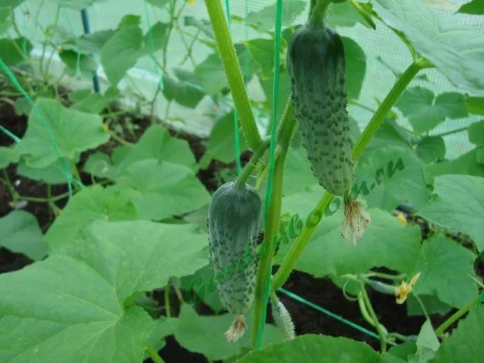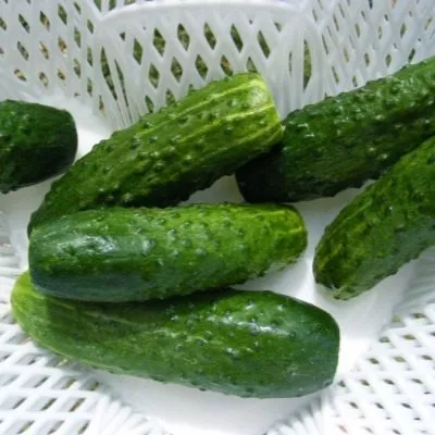 Плоды имеют выровненный, товарный вид. Они короткие, цилиндрической формы, со средней массой 90-100 граммов. Окраска классическая: основной зеленый фон дополнен короткими светлыми полосами, которые обычно доходят лишь до первой трети длины огурца.