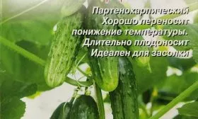 Плоды относятся к корнишонному типу, их длина составляет 10-11 см, а масса около 70 граммов. Зеленцы имеют классическую веретеновидную форму и привлекательную темно-зеленую окраску со светлыми полосами, доходящими примерно до трети длины.