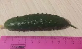 Плоды — корнишоны длиной от 5 до 9 см и массой 70-80 граммов. Они имеют правильную цилиндрическую форму и привлекательную окраску: темно-зеленый фон со светлыми, доходящими до середины плода полосами. Поверхность покрыта частыми бугорками среднего размера с белым опушением.