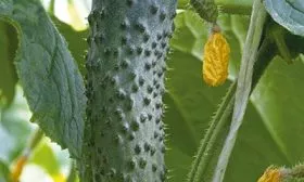 Плоды имеют выровненную, классическую цилиндрическую форму длиной 11-13 см. Средняя масса в 100-120 граммов подтверждает их плотность и отличное соотношение размера и веса. Окраска насыщенная, темно-зеленая, со светлыми, не доходящими до середины плода полосками и умеренной пятнистостью.