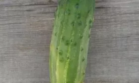Окраска плодов зеленая с хорошо заметными светлыми продольными полосами, доходящими примерно до середины огурца. Поверхность не просто бугорчатая, а именно крупнобугорчатая и ребристая. Опушение сложное (смешанное), средней густоты. В практике огородников сложное опушение означает наличие как белых, так и черных шипиков, что считается традиционным признаком засолочных сортов.