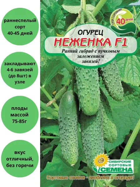 Огурец Неженка — это раннеспелый партенокарпический гибрид первого поколения (F1). Его главная особенность — полная независимость от опыления пчелами. Завязи формируются и развиваются в плоды самостоятельно, что гарантирует стабильный урожай в любую погоду, включая пасмурные и дождливые периоды, когда активность насекомых минимальна.