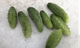 Короткие плоды длиной 8-12 см и массой 80-90 г удобно укладывать в банки любого объема. Среднебугорчатая поверхность хорошо удерживает рассол и пряности. Но главное преимущество — плотная, хрустящая мякоть, которая не размягчается и не образует пустот после термической обработки.