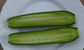Плоды «Шираз» — его главная отличительная черта. Они имеют выровненную, удлиненно-цилиндрическую форму и достигают длины 18-20 см при массе 190-210 граммов. Поверхность абсолютно гладкая, без бугорков, шипов или ребристости, с интенсивной темно-зеленой окраской.