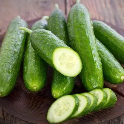 Окраска кожуры ярко-зеленая, равномерная, без продольных светлых полос или желтизны у плодоножки у технически спелых зеленцов. Поверхность покрыта крупными, но редкими бугорками. Мякоть плотная, без пустот, с выраженным хрустом и сильным огуречным ароматом, что подтверждает его салатное назначение. Такое сочетание размеров, формы и аромата делает плоды особенно эффектными для свежего потребления.