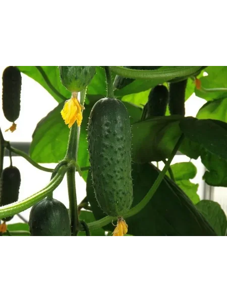 Куст характеризуется мощной силой роста и активным побегообразованием. Листья среднего размера, классической для огурца формы. Важной особенностью является пучковый (букетный) тип завязи — в каждом узле формируется несколько завязей одновременно. Именно это сочетание неограниченного роста с многоплодными узлами и обеспечивает высокую общую урожайность, делая растение внешне очень продуктивным.