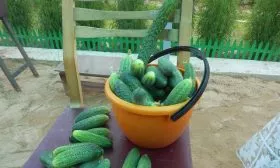 Плоды имеют узнаваемый внешний вид, типичный для классических засолочных сортов. Они короткие, длиной 6-8 см, и выровненные, цилиндрической формы, без перетяжек. Окраска светло-зеленая с продольными полосами более светлого оттенка, которые имеют среднюю длину. Также наблюдается средневыраженная пятнистость.