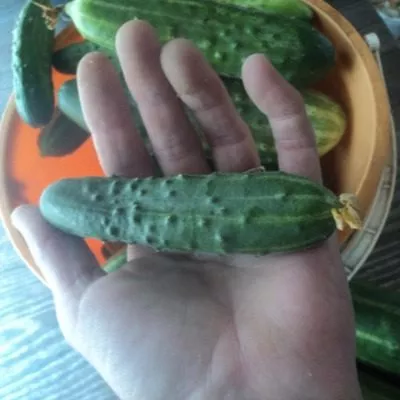 Окраска плодов насыщенная, темно-зеленая, без светлых полос, что свидетельствует о стабильном накоплении хлорофилла. Поверхность покрыта выраженными бугорками, что характерно для многих пчелоопыляемых сортов и гибридов салатного назначения.