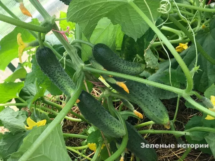 Название «Зеленая гроздь» отражает характер плодоношения: завязи формируются часто, создавая эффект обильной грозди. Однако важно понимать, что это не современный пучковый (букетный) гибрид, где в одном узле может быть 5-10 завязей. Здесь их количество меньше, но расположение действительно плотное, что визуально напоминает гроздь и гарантирует стабильный сбор зеленцов.