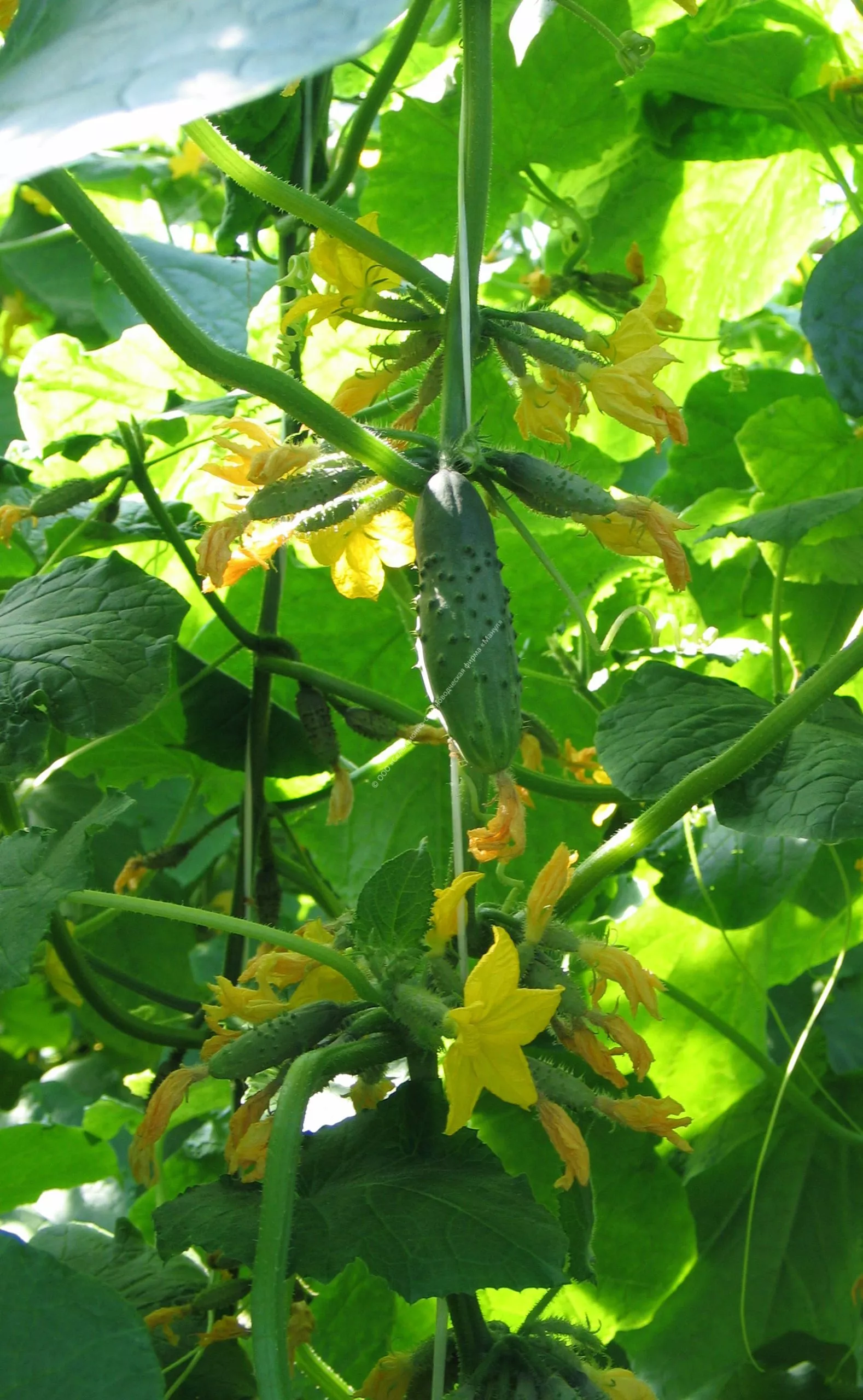 В каждом узле формируется несколько завязей. Если первый, самый ранний зеленец перерастет и останется на плети, он будет оттягивать на себя питательные вещества. Это тормозит развитие и налив следующих огурчиков в том же узле, что в итоге снижает общую урожайность с куста.