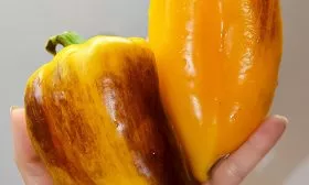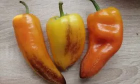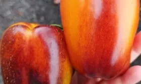 - Промежуточная стадия (переходная фаза). Постепенно на смену фиолетовому приходят теплые оранжевые и красные тона. Происходит это неравномерно, из-за чего на кожице возникают уникальные мраморные разводы, подтеки и румянец. В этот момент каждый перец на кусте выглядит по-особенному.