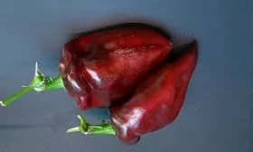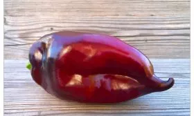 Главная отличительная черта сорта — выдающаяся крупноплодность. Плоды имеют удлиненно-конусовидную форму, часто с характерной легкой изогнутостью кончика. В фазе технической спелости они окрашены в темно-зеленый цвет, а при достижении биологической зрелости приобретают равномерную, насыщенно-красную окраску с выраженным глянцевым блеском.