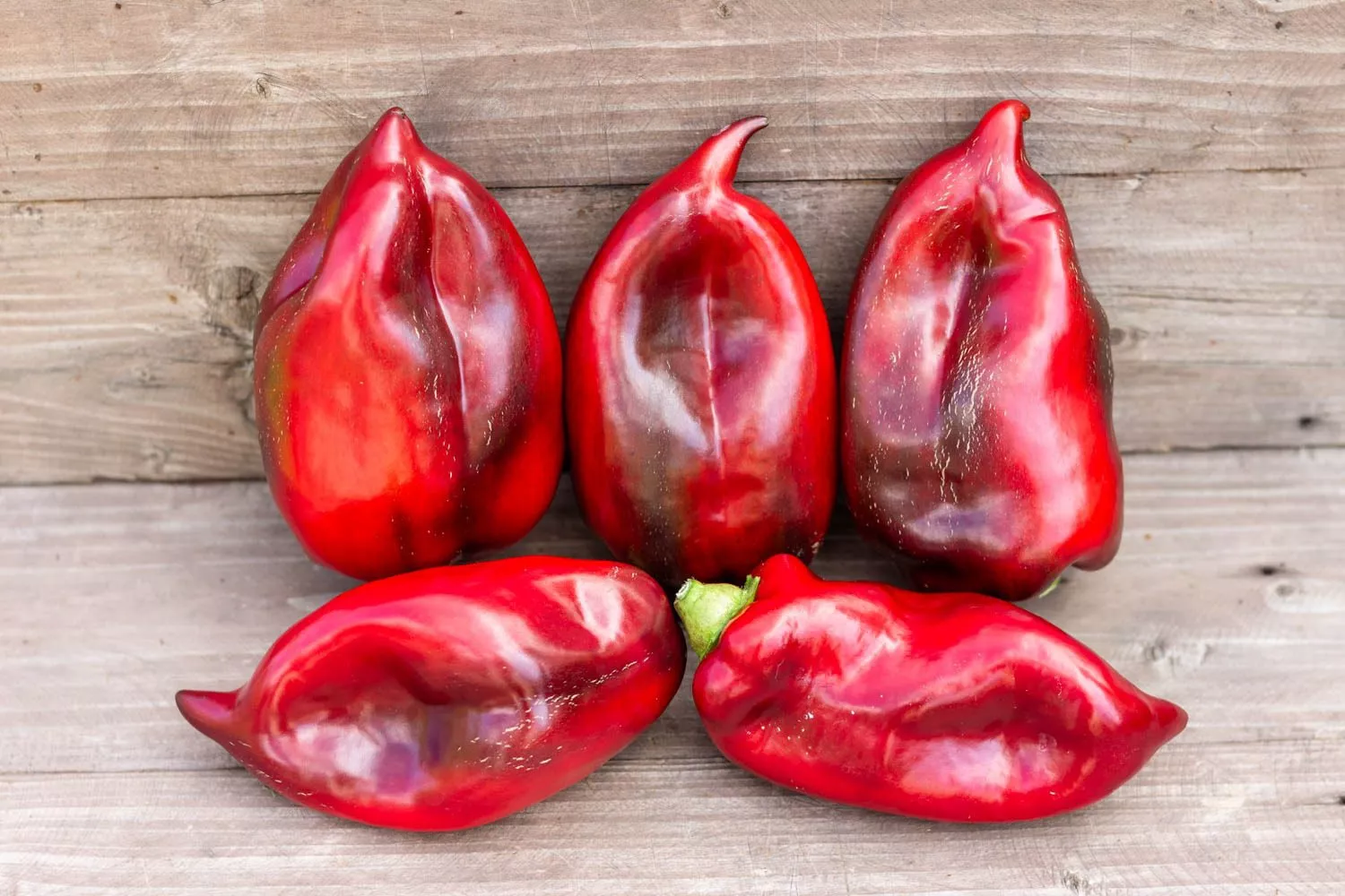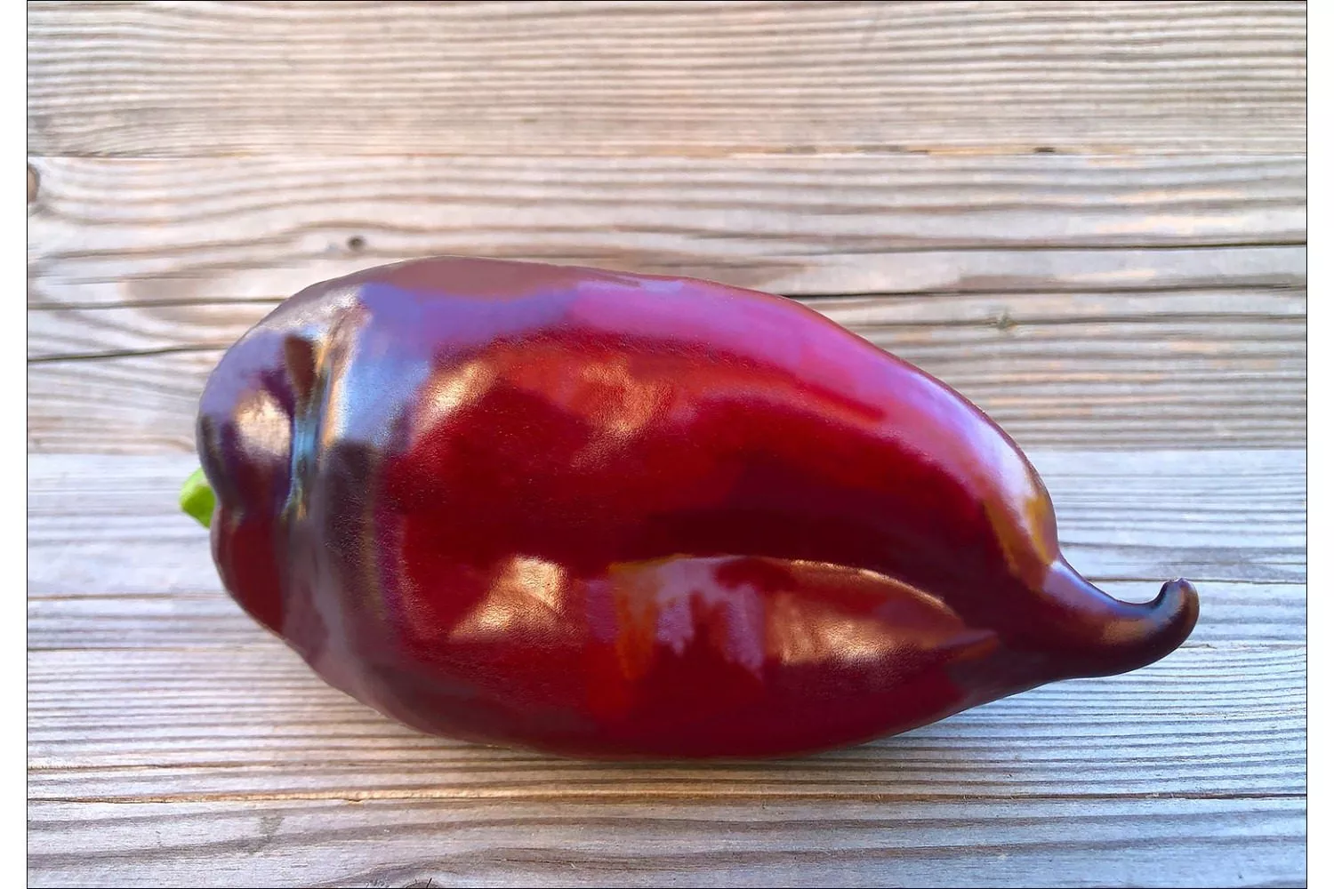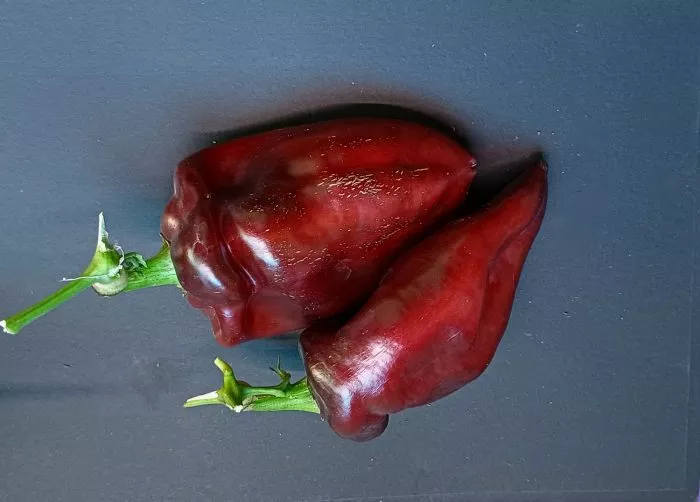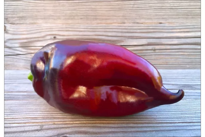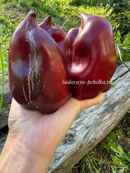 Главная отличительная черта сорта — выдающаяся крупноплодность. Плоды имеют удлиненно-конусовидную форму, часто с характерной легкой изогнутостью кончика. В фазе технической спелости они окрашены в темно-зеленый цвет, а при достижении биологической зрелости приобретают равномерную, насыщенно-красную окраску с выраженным глянцевым блеском.