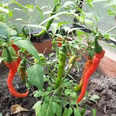 Форма плодов удлиненно-коническая, часто с характерным изгибом кончика, что соответствует описанию «роговидная». Плодоножка прочно крепится к кусту, а сами перцы преимущественно направлены вниз или в стороны.