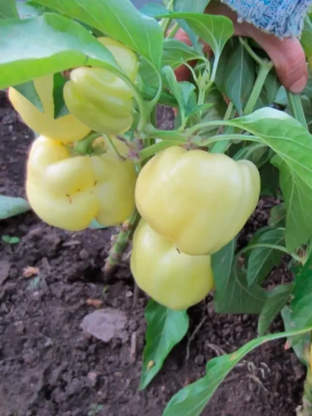 Куст сорта Белое золото среднерослый, но его побеги могут быть хрупкими, особенно под тяжестью крупных плодов массой от 100 до 450 граммов. Ни в коем случае не отрывайте и не откручивайте перцы руками.