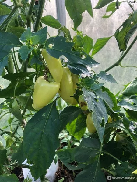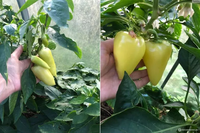 Главная отличительная черта плодов этого гибрида — их динамичная, двухфазная окраска, которая служит точным индикатором стадии зрелости. В технической спелости, когда семена уже сформировались, а стенки достигли максимальной толщины, перцы приобретают характерный желтоватый, почти бело-молочный оттенок. Сбор урожая на этой стадии практикуют для длительного хранения и транспортировки.