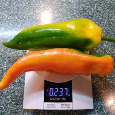 Средняя масса плода соответствует заявленным 200 граммам, однако при оптимальном питании и нормировании завязей не является редкостью получение экземпляров по 250-300 граммов. Длина таких гигантов может достигать 20-25 см. Плоды преимущественно поникающие (смотрят вниз), что является естественной защитой от солнечных ожогов.
