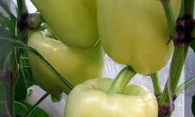 Плоды – главное достоинство сорта. Их цилиндрическая форма отличается выравненностью и часто имеет слабовыраженную ребристость в области прикрепления к плодоножке. В фазе технической спелости перцы окрашены в насыщенный зеленый цвет, который по мере созревания сменяется глубоким, темно-желтым, почти абрикосовым оттенком.