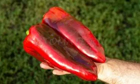 Истинная гордость сорта — его плоды. Они имеют классическую кубовидную форму с выраженной ребристостью и глянцевой поверхностью. В технической спелости перцы темно-зеленые, при полном созревании наливаются насыщенным, равномерным красным цветом. Мякоть очень сочная, мясистая и толстостенная, толщина стенки часто достигает 8-10 мм, что и обеспечивает рекордный вес, заявленный до 500 граммов и более.