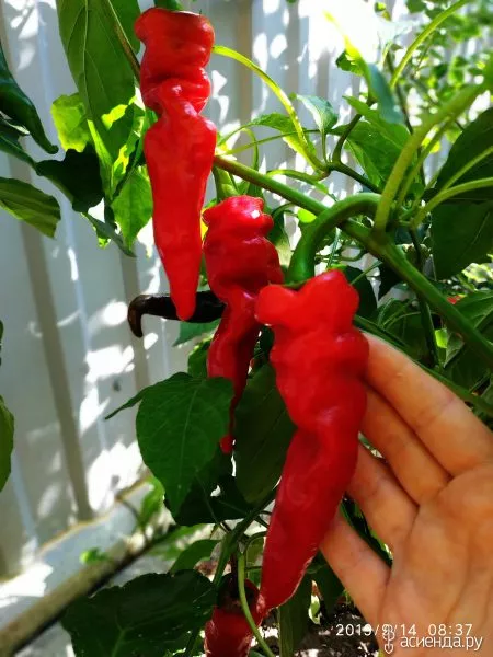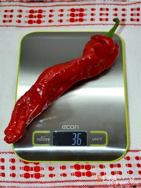 Плоды отличаются классической конусовидной формой, часто с заметной ребристостью в области прикрепления к плодоножке. Эта ребристость является сортовой особенностью и не считается дефектом. Основное визуальное преобразование происходит в процессе созревания: в технической (съемной) спелости перцы имеют темно-зеленый цвет, а при достижении биологической зрелости равномерно окрашиваются в ярко-красный, как указано в технических характеристиках.