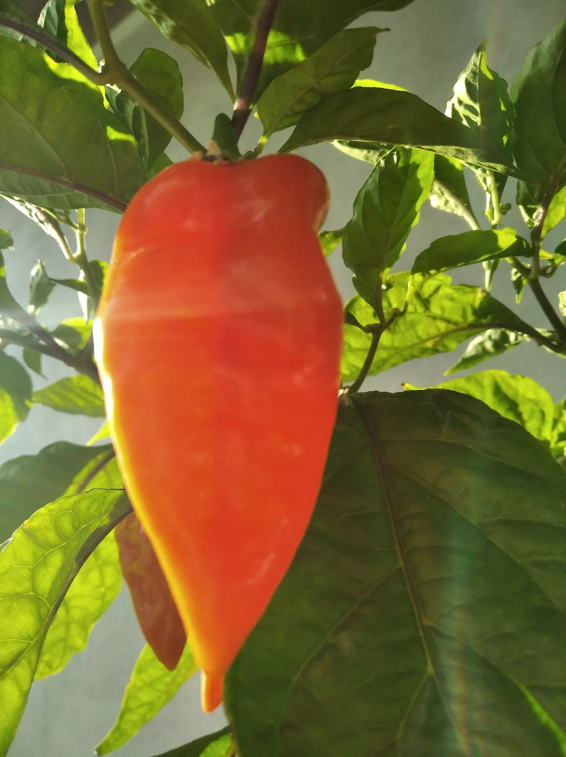 Листья имеют классическую для перца форму и насыщенный зеленый цвет, создавая красивый контрастный фон для будущих плодов. В период активного плодоношения куст преображается, буквально усыпанный яркими перчиками. Это превращает его в живую декоративную композицию, где плоды играют роль оранжевых фонариков.