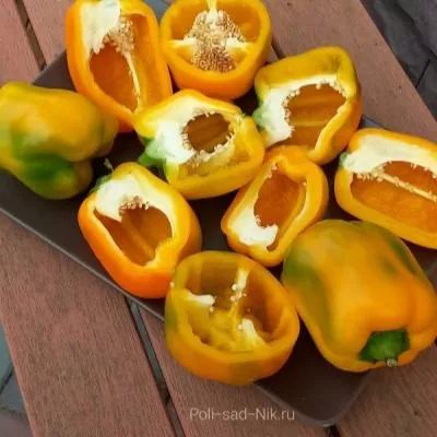Отличный сладкий вкус и сочная мякоть обеспечивают высокое качество свежих салатов, лечо, соусов и заморозки. Темно-желтая, солнечная окраска в биологической спелости не только придает блюдам привлекательный вид, но и свидетельствует о высоком содержании полезных каротиноидов.