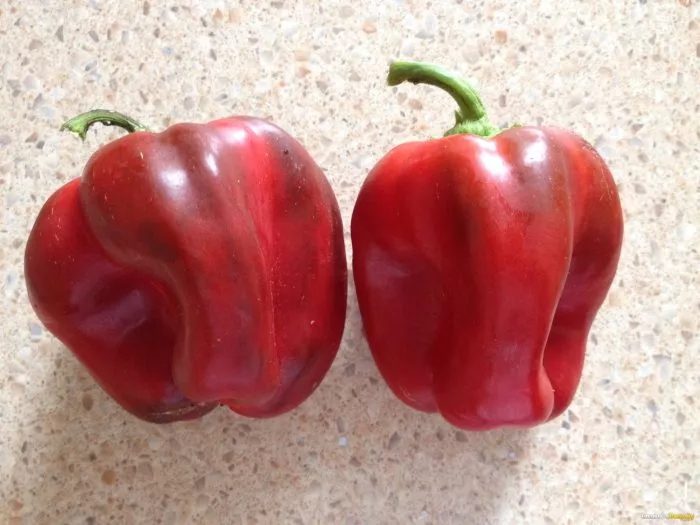 Форма плодов классическая кубовидная, но часто с заметным удлинением, что делает их похожими на призму. Поверхность ярко выраженно ребристая, что особенно заметно в области плодоножки. Эта структурная особенность, наряду с плотной мякотью, придает перцу исключительную механическую прочность. Он хорошо переносит транспортировку и практически не мнется при сборе.