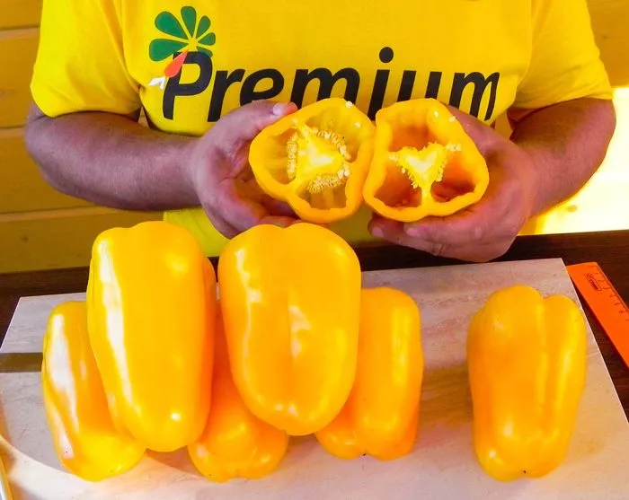 Классический сладкий вкус без малейшей горчинки и нежный аромат делают этот перец желанным ингредиентом в свежем виде. Его солнечный цвет визуально обогащает любые салаты и нарезки. Кубическая форма и средний размер плода массой 180–200 граммов, а также толстые сочные стенки предопределяют его идеальную пригодность для фарширования.