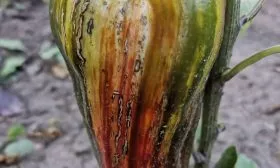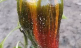 - Вершинная гниль. Это физиологическое нарушение, а не инфекция. Проявляется как темное, сухое, вдавленное пятно на верхушке плода. Основные причины – дефицит кальция и неравномерный полив, приводящий к сбоям в усвоении этого элемента. Крупные плоды сорта, массой от 100 до 300 граммов, особенно чувствительны к перебоям в водоснабжении. Профилактика заключается в стабильном, регулярном поливе без пересыхания грунта и обязательной подкормке кальциевой селитрой под корень в период активного роста завязей.