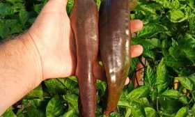 Шоколадная вариация полностью оправдала ожидания. Она унаследовала характерную тонкостенность и нежную, лишенную горечи мякоть. Главным же достижением стал устойчивый глубокий коричневый цвет кожицы в фазе полной биологической спелости. Этот оттенок не является результатом гибридизации с острыми сортами, а обусловлен накоплением специфических пигментов — антоцианов, что делает плод особенно привлекательным для свежего потребления и украшения кулинарных блюд.