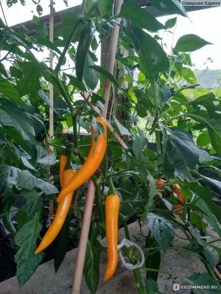 Плоды являются самой выразительной частью растения. Они располагаются на кусте торчащими вверх или в стороны, что придает растению нарядный, декоративный вид. Их форма классифицируется как удлиненно-конусовидная, напоминающая узкий кинжал. Плоды могут быть как идеально прямыми, так и иметь небольшой, плавный изгиб, что добавляет визуального разнообразия.