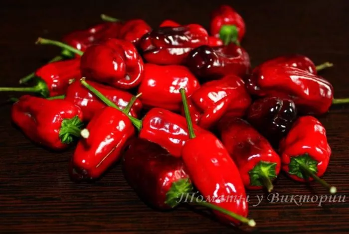 Мякоть у них тонкая, но при этом достаточно плотная и хрустящая, что является преимуществом для консервирования и сушки. Вкус соответствует классическому представлению о перце: выраженный перечный аромат сочетается с заметной сладостью у плодоножки. Острота присутствует отчетливо, но ее уровень умеренный и не является запредельным.
