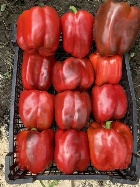 Такой однородный, «товарный» вид всего урожая упрощает как упаковку для продажи, так и подготовку к консервированию, где важна равномерность нарезки. Крупные размеры и вес делают эти перцы очень эффектными в свежих нарезках и салатах.