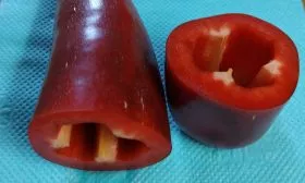 Благодаря сладости и сочности, перец идеален для свежих витаминных салатов и нарезок. Его темно-вишневый цвет создает эффектные цветовые акценты в овощных ассорти. Средний размер и конусовидная форма плодов массой 100-150 граммов делают их удобными для фарширования мясной, овощной или крупяной начинкой — плотные стенки хорошо держат форму в процессе приготовления.