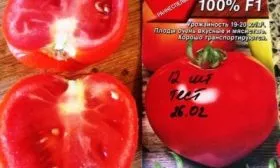 Мякоть обладает плотной, мясистой консистенцией с небольшим количеством семян. Высокое содержание сухих веществ и сахаров обеспечивает насыщенный, классический томатный вкус с гармоничным балансом сладости и кислоты. Окрас в биологической спелости — глубокий, равномерный красный без зеленого пятна у плодоножки, что свидетельствует о равномерном созревании.