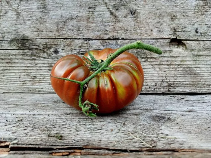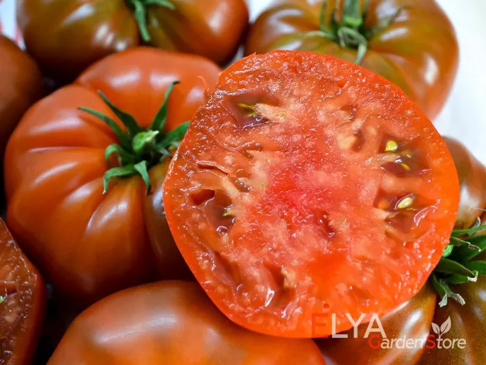 Этот сорт выделяется в ряду индетерминантных томатов не только внушительной высотой куста, но и уникальной окраской плодов. Их насыщенно-коричневый, почти шоколадный цвет с контрастными темно-зелеными плечиками — визитная карточка сорта. Такой окрас обусловлен высоким содержанием антоцианов, которые не только придают цвет, но и считаются полезными антиоксидантами.