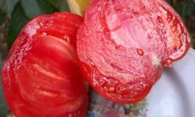 При резких колебаниях влажности почвы или перезревании на кусте крупные плоды склонны к растрескиванию. Мякоть многокамерная, очень мясистая и сочная, с характерной сахарной, «арбузной» текстурой на изломе. Семян внутри немного, что является типичным признаком современных крупноплодных сортов.