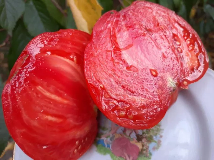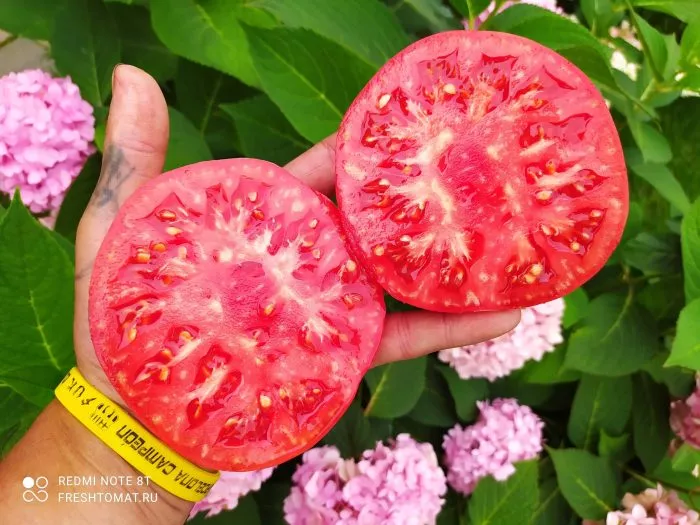 При резких колебаниях влажности почвы или перезревании на кусте крупные плоды склонны к растрескиванию. Мякоть многокамерная, очень мясистая и сочная, с характерной сахарной, «арбузной» текстурой на изломе. Семян внутри немного, что является типичным признаком современных крупноплодных сортов.