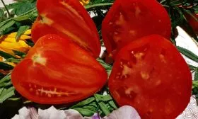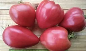Кожица у плодов прочная, но не грубая, что в сочетании с мясистой консистенцией защищает их от растрескивания при соблюдении режима полива. Внешний вид этих гигантских «сердец» малинового цвета делает сорт одним из самых эффектных на участке.