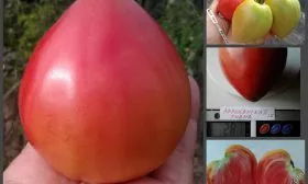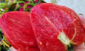 Полностью созревший томат приобретает равномерный, глубокий малиново-розовый цвет. Мякоть исключительно плотная, многокамерная, с высоким содержанием сухих веществ. При разрезе она сахаристая, с минимальным количеством семян и свободного сока, что характерно для мясистых сортов салатного назначения. Такая структура обеспечивает не только выдающийся вкус, но и хорошую транспортабельность зрелых плодов.