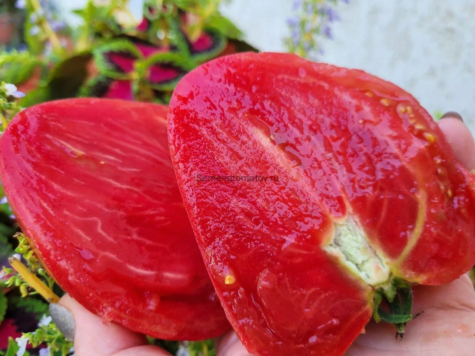 Полностью созревший томат приобретает равномерный, глубокий малиново-розовый цвет. Мякоть исключительно плотная, многокамерная, с высоким содержанием сухих веществ. При разрезе она сахаристая, с минимальным количеством семян и свободного сока, что характерно для мясистых сортов салатного назначения. Такая структура обеспечивает не только выдающийся вкус, но и хорошую транспортабельность зрелых плодов.