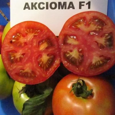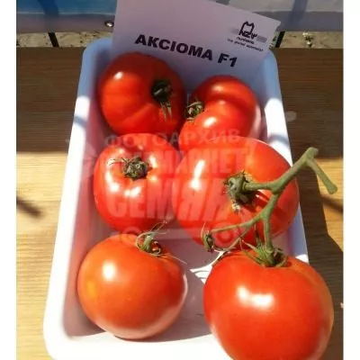 Плоды Аксиомы имеют узнаваемую, характерную форму. Основная форма округлая, но с четко выраженной слегка сердцевидной вершинкой, что придает томату эстетичную индивидуальность. Ребристость у плодоножки отсутствует или выражена крайне слабо, поверхность гладкая.