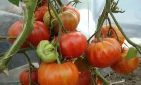 На каждой кисти может завязываться до 5-6 плодов. При своей массе в 80-100 граммов они создают значительную нагрузку на невысокий куст. В период полного плодоношения растение приобретает характерный вид: ярко-красные плоды, часто касающиеся земли, плотно «облепляют» карликовый куст со всех сторон.
